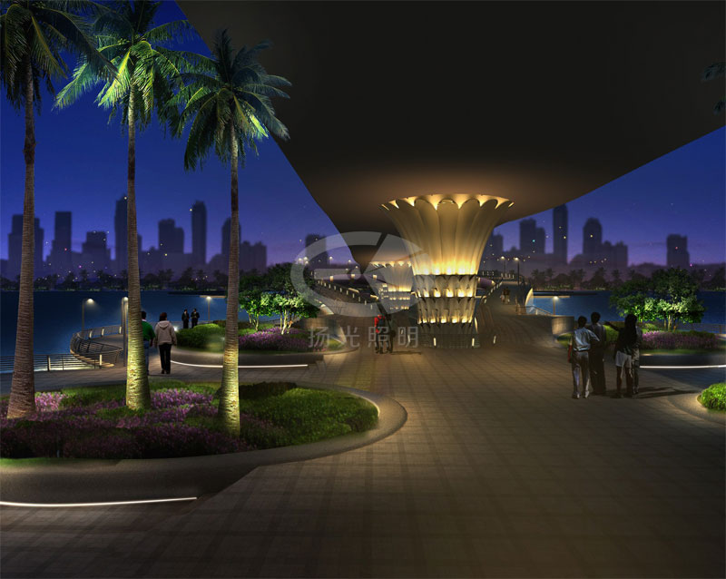 橋的主體是大橋最重要的部分,是大橋的靈魂,所以必須用燈光來(lái)表現(xiàn)。橋板最大的特點(diǎn)是與上面的欄桿和下面的橋洞形成鮮明的對(duì)比。這種虛實(shí)對(duì)比的照明表現(xiàn)是橋板側(cè)光效果的定位和整個(gè)橋體立面的照明設(shè)計(jì)。