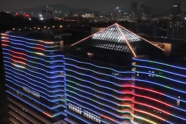 建筑頂部幕墻采用 RGBW 全彩燈光,通過智能控制,以立面動態(tài)圖案與定制動畫演繹企業(yè)形象,吸引多視角關(guān)注,深化企業(yè)品牌辨識度;控制系統(tǒng)設(shè)置平日、節(jié)假日模式,可根據(jù)不同節(jié)日定制專屬光影內(nèi)容,并與廣場噴泉實現(xiàn)光影聯(lián)動,營造不同的場景氛圍。樓身則以大功率燈光做整體烘托,通過光影塑造建筑體量,強化空間視覺存在感。